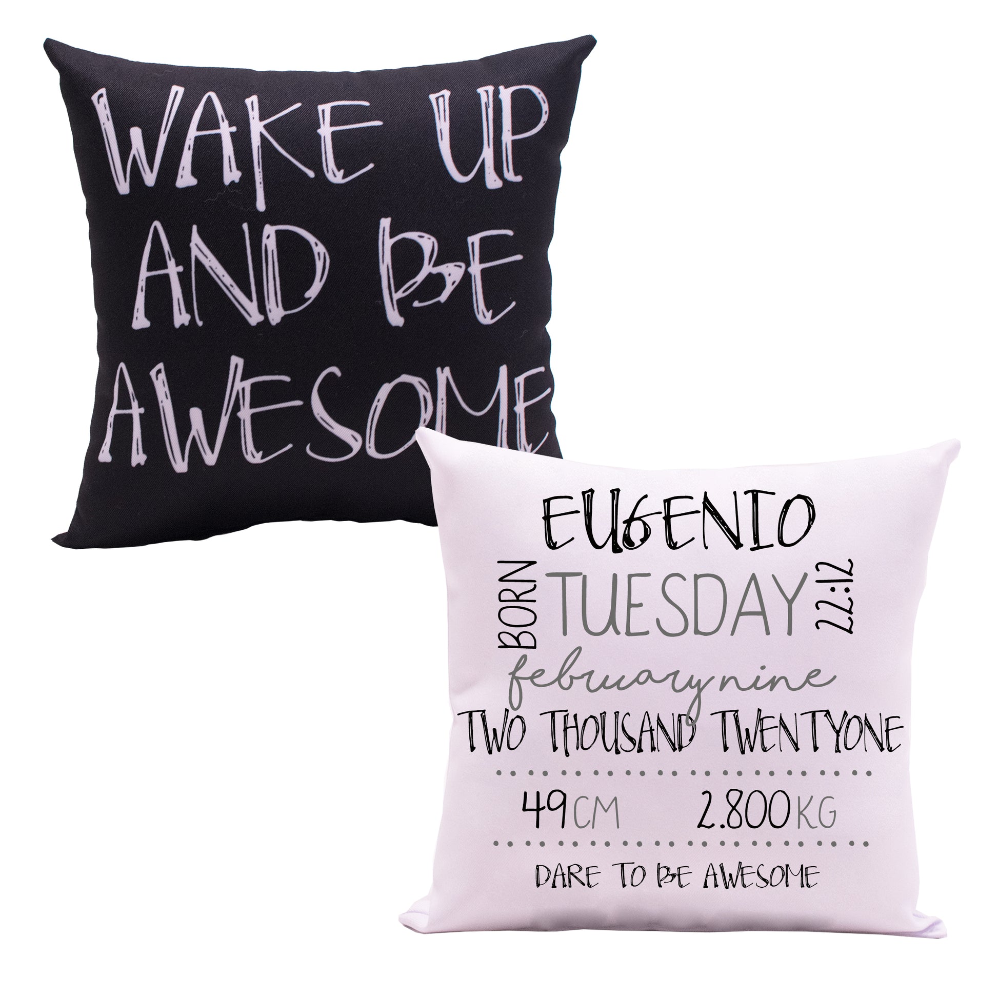 Nuestro Set de 2 Cojines Decorativos Personalizados es perfecto para complementar la decoración del cuarto de tu pequeño. Con diseños personalizados que incluyen su nombre y datos de nacimiento, estos cojines son más que un adorno: son un recuerdo especial que atesorarás para siempre.