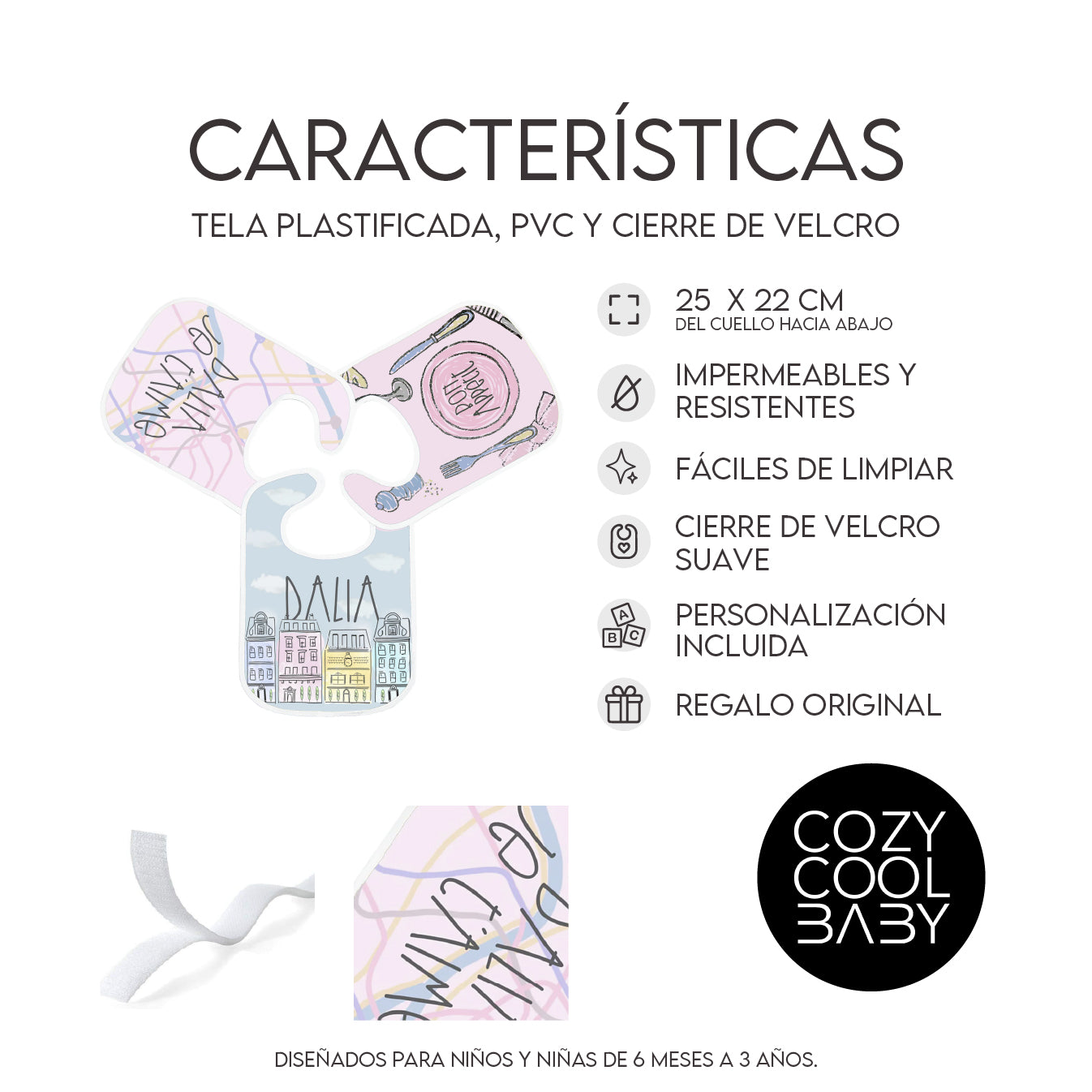 Nuestro Set de 3 Baberos Plastificados Personalizados es perfecto para mantener a tu peque limpio durante cada comida. Con un diseño impermeable y fácil de limpiar, estos baberos personalizados con su nombre son prácticos, cómodos y adorables.